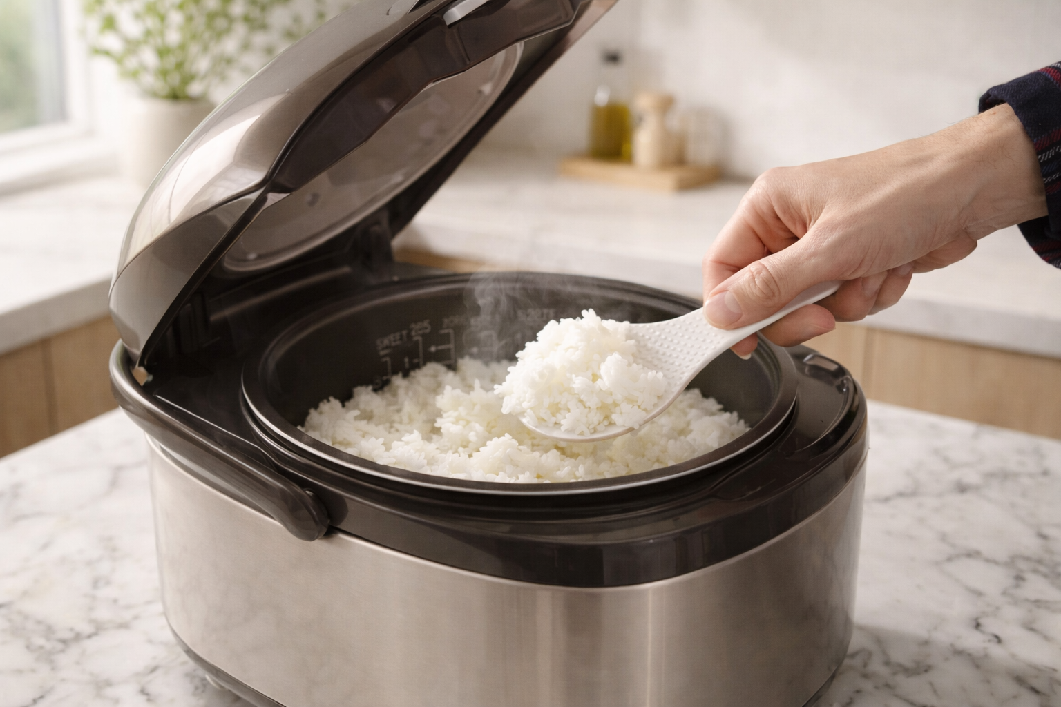 After cooking is completed, the appliance maintains the rice at a safe serving temperature without continuing to cook it aggressively.